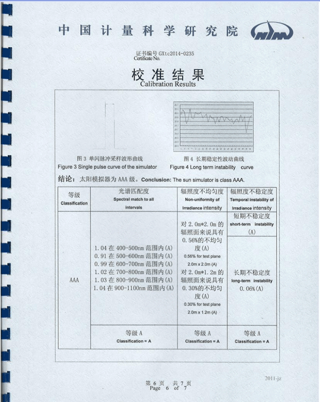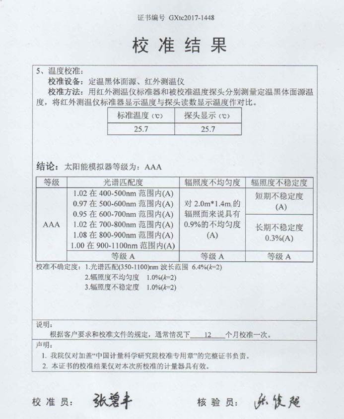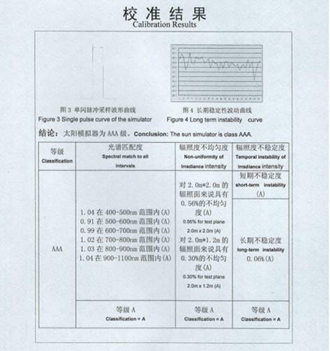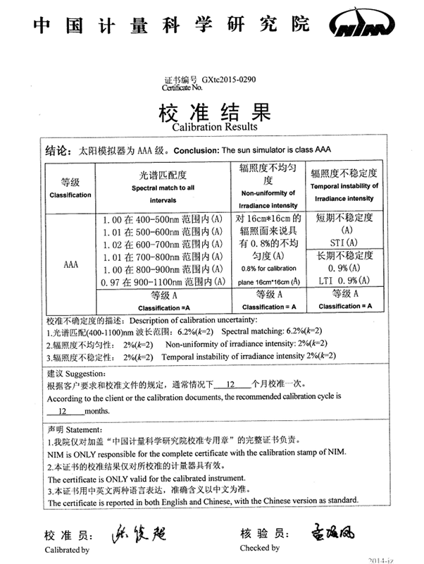 設(shè)備現(xiàn)場(chǎng)計(jì)量當(dāng)中,中國(guó)計(jì)量院計(jì)量人員對(duì)陜西眾森的設(shè)備給予了充分的肯定,認(rèn)為他們的設(shè)備性能卓越,光譜失配度小于10%,遠(yuǎn)遠(yuǎn)好于國(guó)際標(biāo)準(zhǔn)25%。 不均勻度小于1%,不穩(wěn)定度小于0.1%,遠(yuǎn)遠(yuǎn)好于國(guó)際標(biāo)準(zhǔn)的的1%,達(dá)到3A+標(biāo)準(zhǔn)。