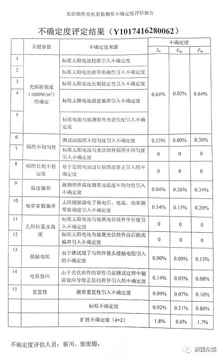 近日,眾森使用自主研發(fā)的太陽電池組件測(cè)試儀GIV-20A+,對(duì)72片PERC單晶組件的測(cè)試過程進(jìn)行了測(cè)量不確定度評(píng)定,評(píng)定結(jié)果為:最大功率的測(cè)量不確定度為1.7%。