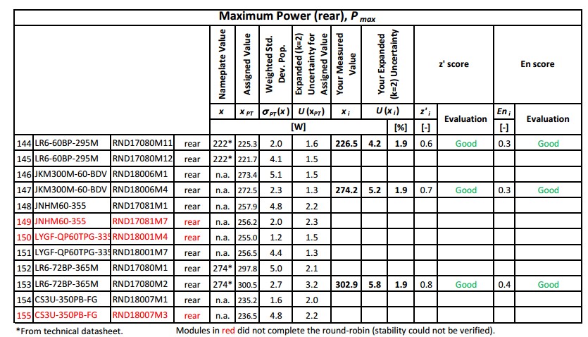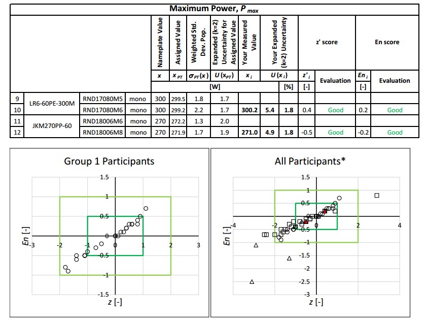此次國(guó)際能力驗(yàn)證測(cè)試項(xiàng)目,是按照國(guó)際最新標(biāo)準(zhǔn)IEC 60904-1-2雙面組件電壓電流測(cè)試方法,要求各實(shí)驗(yàn)室對(duì)單面組件和雙面組件樣品在不同測(cè)試條件下,分別測(cè)量關(guān)鍵光電性能參數(shù),包括短路電流、開路電壓、正面功率、背面功率、總功率、雙面率等。此次比對(duì)測(cè)試將國(guó)際著名實(shí)驗(yàn)室的結(jié)果作為參考值,其他參與者測(cè)試結(jié)果與之對(duì)比,根據(jù)Z值和En值進(jìn)行評(píng)估,結(jié)果分為Good(好),Satisfactory(滿意),Questionable(問題),Unsatisfactory(不滿意)。