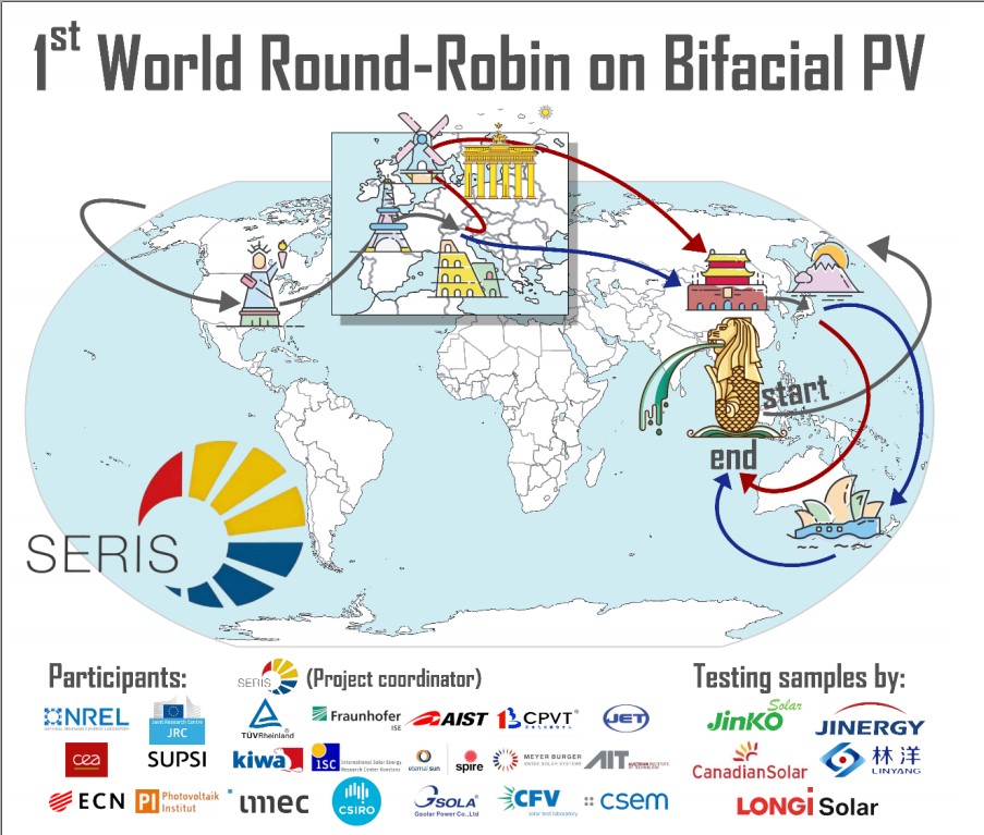 世界雙面太陽能組件國(guó)際比對(duì)項(xiàng)目由新加坡能源研究所(SERIS)組織,于2018年2月啟動(dòng),此次能力驗(yàn)證項(xiàng)目共有十三個(gè)國(guó)家和地區(qū)的著名研究機(jī)構(gòu)和實(shí)驗(yàn)室參與,包括NREL,JRC,AIST,F(xiàn)raunhofer等。